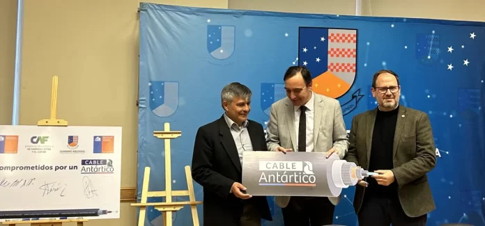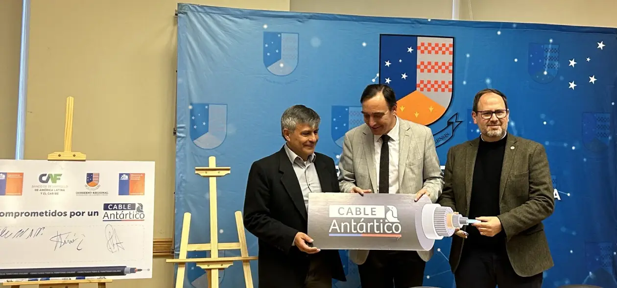 En el Gobierno Regional, el subsecretario de Telecomunicaciones, Claudio Araya San Martín junto al representante en Chile de la CAF – Banco de Desarrollo de América Latina y el Caribe, Julián Suárez y el gobernador regional, Jorge Flies, anunciaron el proyecto que busca impulsar el primer cable submarino de fibra óptica que unirá al continente chileno con la Antártica, facilitando el intercambio de datos y mejorando la conectividad digital en el territorio antártico.