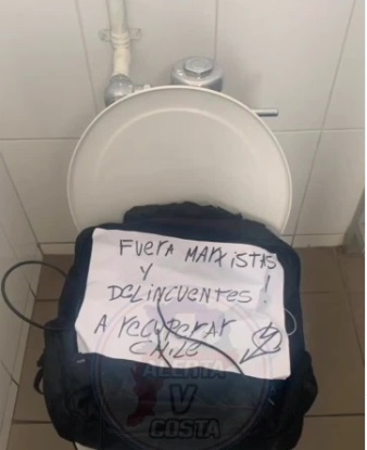 La mochila donde se encontraba el supuesto explosivo tenía encima un papel rayado con el mensaje: «¡Fuera marxistas y delincuentes!, «A recuperar Chile«.
