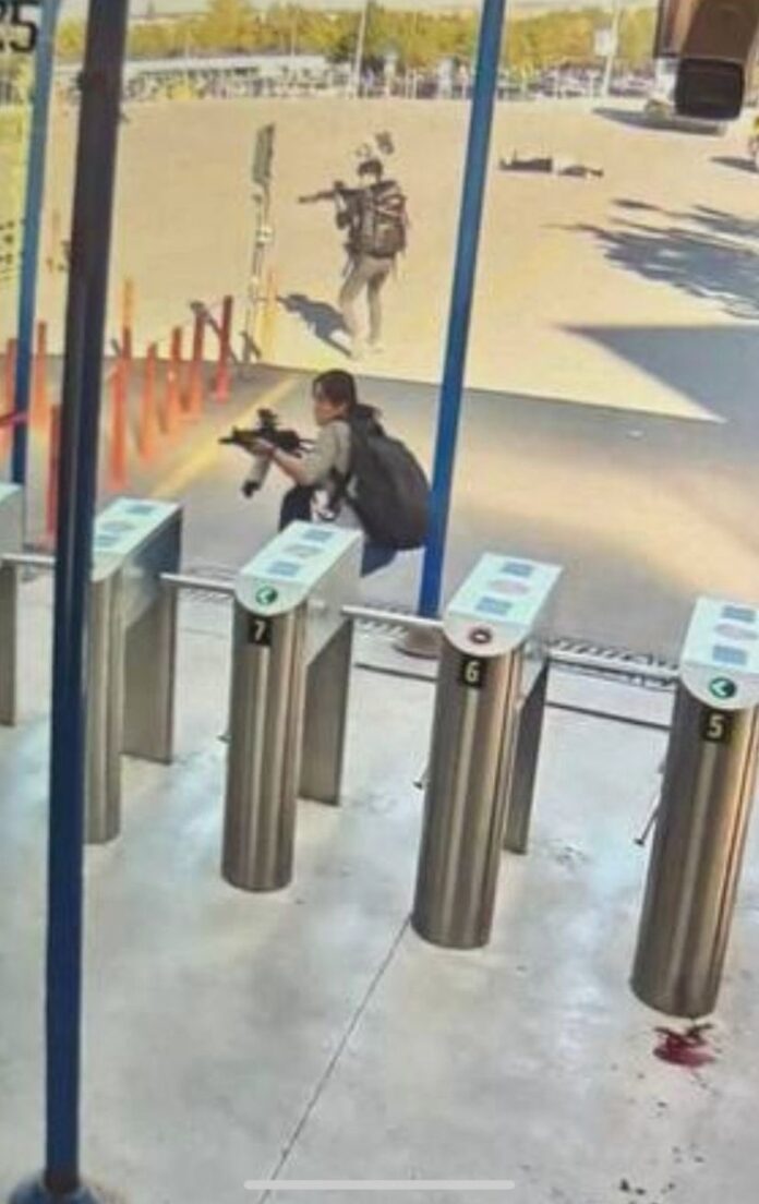 Las imágenes de la cámara de seguridad del ataque, transmitidas por televisión, mostraron a un hombre vestido de civil que llevaba una mochila y sostenía un rifle de asalto.
