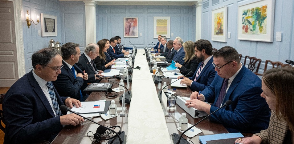 En el encuentro desarrollado en el Departamento de Estado, en Washington DC, las autoridades de ambos países se reunieron inicialmente en un encuentro privado, en el que abordaron temas de relevancia para los dos países, como el contexto global y la democracia en la región. En esa instancia, destacaron el interés de estrechar las relaciones bilaterales, para lo que Estados Unidos comprometió impulsar una profundización de la inversión directa en Chile, especialmente en el sector tecnológico.