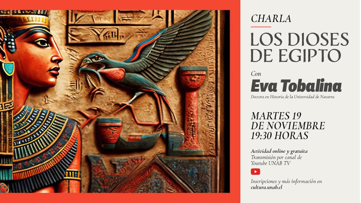 - Cultura UNAB te invita a una nueva charla que te llenará de conocimiento. Esta vez presentaremos la conferencia online «Los Dioses de Egipto», la cual será presentada por la Dra. en Historia Eva Tobalina Oraá. El evento tiene carácter gratuito y se transmitirá por el canal de YouTube UnabTV.