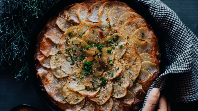 - Se hornea a 180°C durante 30 minutos o hasta que las papas estén doradas.