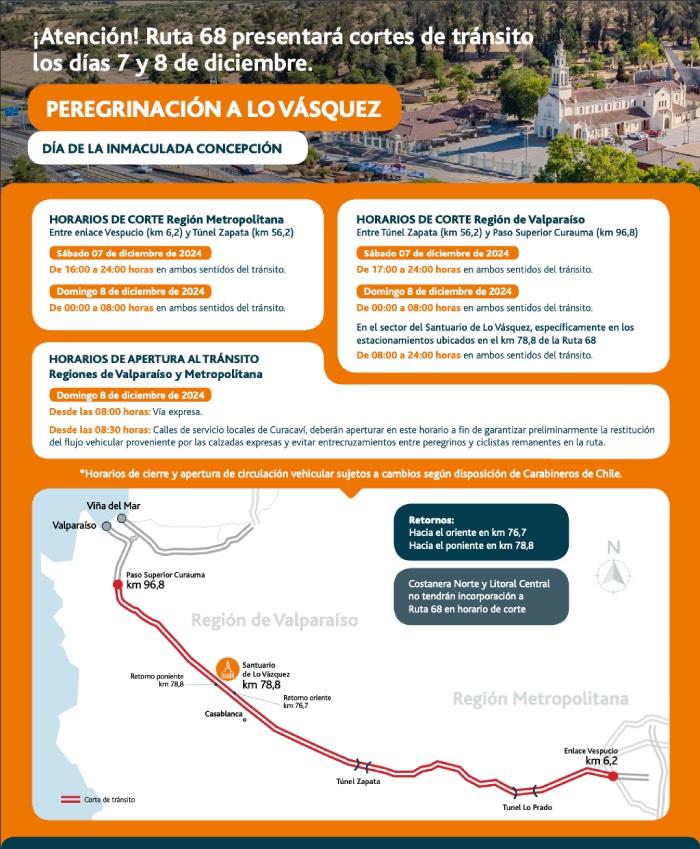 Con motivo de la tradicional peregrinación al Santuario de Lo Vásquez, ubicado en el kilómetro 78,8 de la Ruta 68, Rutas del Pacífico implementará una serie de medidas viales en apoyo a las contempladas por las autoridades y Carabineros de Chile.