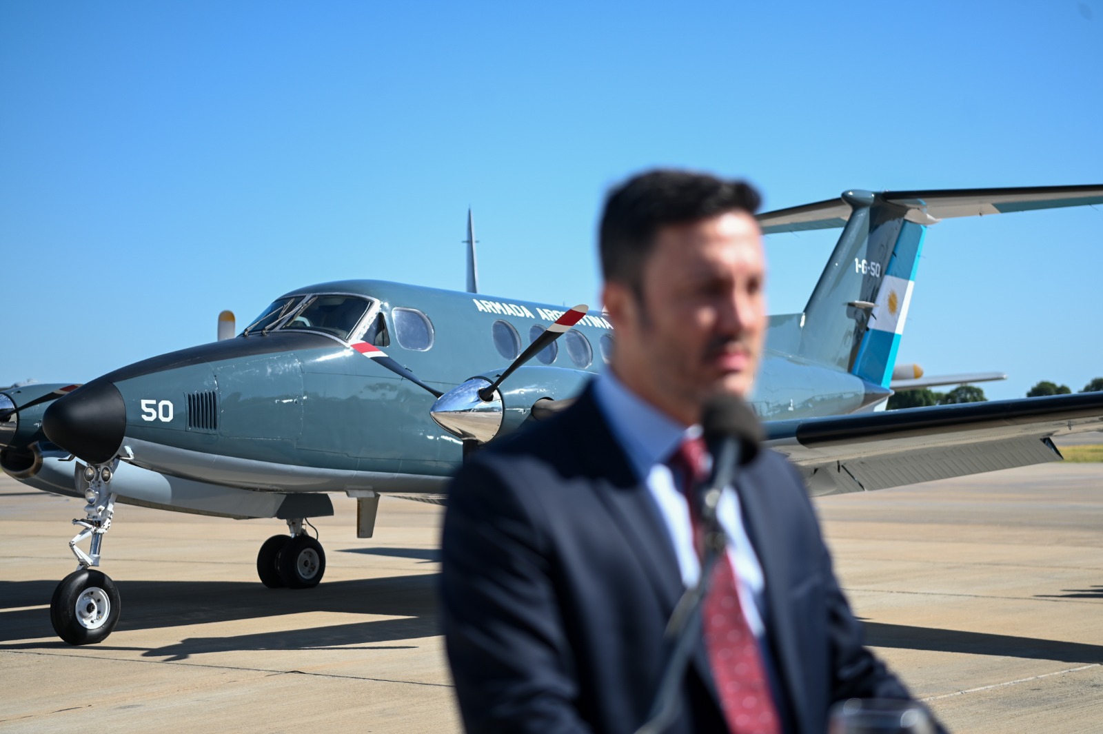 “La incorporación de un avión de estas características no solamente nos va a permitir entrenar, sino que va a posibilitar desarrollar múltiples tareas. Estas aeronaves multipropósito sirven para el despliegue territorial y brindan una mejor y mayor logística, entre otras cosas, para poder seguir llegando a nuestra Antártida, reafirmando nuestros derechos por más de 120 años”, arengó el ministro de Defensa argentino Luis Petri durante la entrega de segundo avión Beechcraft TC12B Hurón para la Armada Argentina, que se realizó este miércoles 22 de enero.