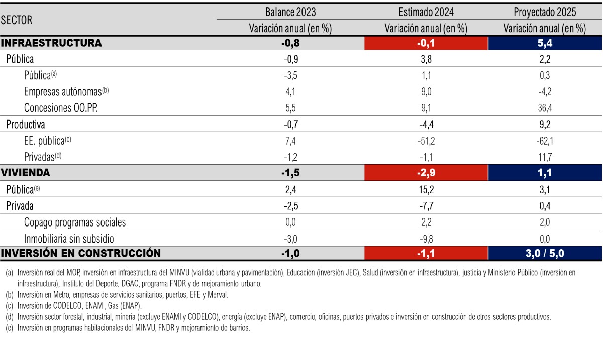 Para 2025 la CChC estima que la inversión total en Construcción registraría un aumento anual de 4%, producto básicamente de la muy baja base de comparación que representa el año 2024 y la mayor inversión esperada sobre todo en proyectos de minería y energía.