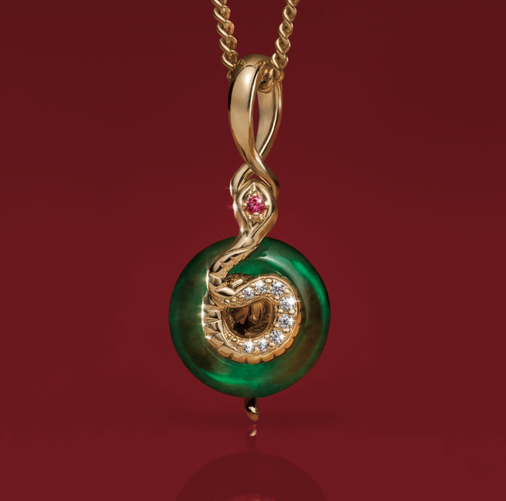 La colección fusiona lo clásico y lo moderno, con símbolos icónicos del Año Nuevo Lunar, con colores vibrantes como el verde jade, asociado con la abundancia y la protección, combinado con detalles dorados que evocan prosperidad, como son el charm colgante con acentos de cristal de Murano o el de serpiente enroscada.