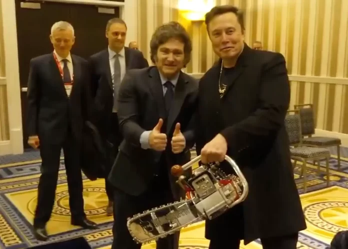 Milei, haciendo gala de su histrionismo se reunió con el empresario Elon Musk, a quien le regaló una motosierra y de paso da una señal mas de que su ego esta por sobre el cargo que representa.