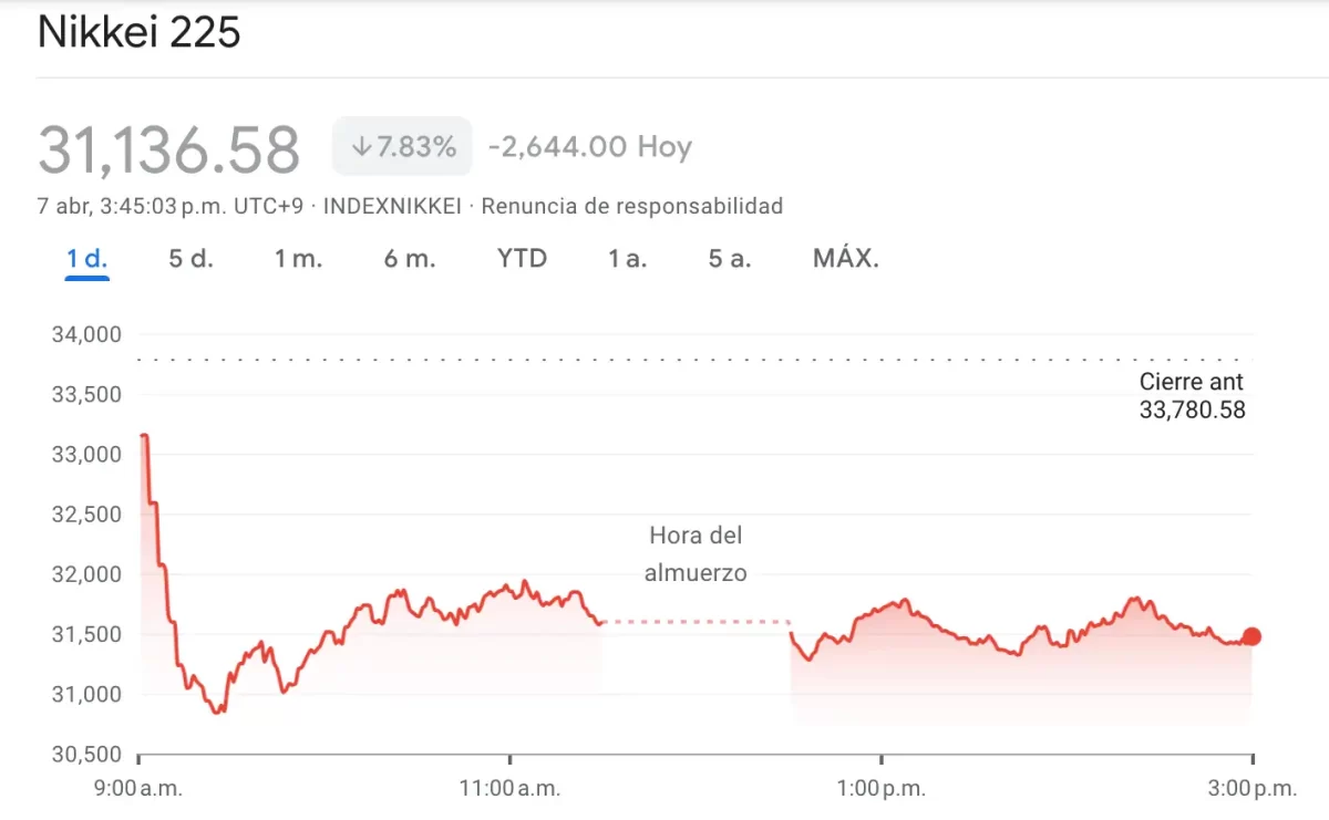 La Bolsa de Tokio cayó 7,83%. Japon fue gravada cobn aranceles de 24% por parte de EEUU. Así el Nikkei, cerró con una pérdida de 2.644 puntos, situándose en 31.136,58 unidades.