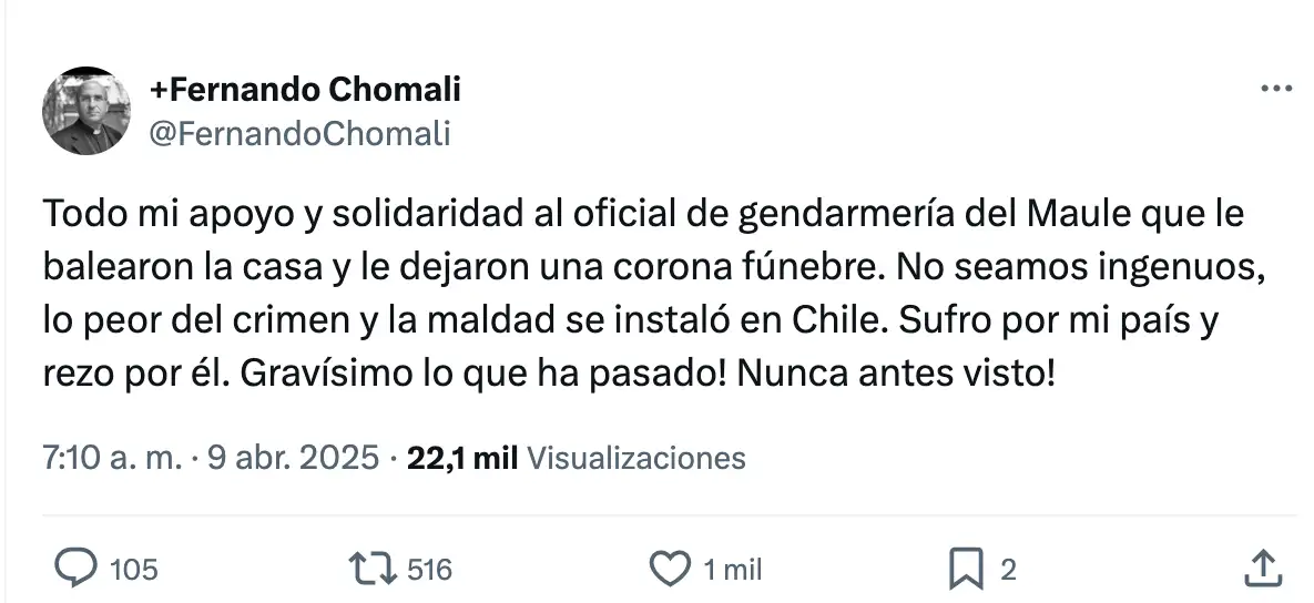 «Todo mi apoyo y solidaridad al oficial de gendarmería del Maule que le balearon la casa y le dejaron una corona fúnebre. No seamos ingenuos, lo peor del crimen y la maldad se instaló en Chile. Sufro por mi país y rezo por él. Gravísimo lo que ha pasado! Nunca antes visto!», posteó el cardenal Fernando Chomali.