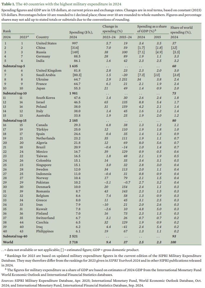El nuevo informe del Instituto Internacional de Estudios para la Paz de Estocolmo (SIPRI), publicado el 28 de abril, confirmó que la inversión global en materia de Defensa global alcanzó los 2.718 mil millones de dólares en 2024, lo que representa un aumento interanual del 9,4 %, el más alto desde el fin de la Guerra Fría, con una media internacional del 2,5 % del PBI global.