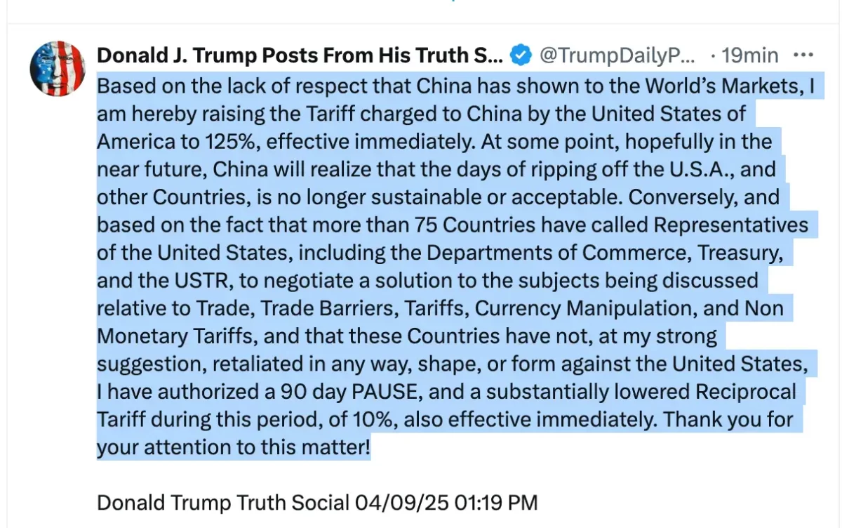 «Debido a la falta de respeto que China ha mostrado hacia los mercados mundiales, por la presente aumento el arancel que Estados Unidos le impone a China al 125%, con efecto inmediato. En algún momento, ojalá en un futuro próximo, China comprenderá que estafar a EE. UU. y a otros países ya no es sostenible ni aceptable», publico el Presidente Donald Trump en sus RSS.