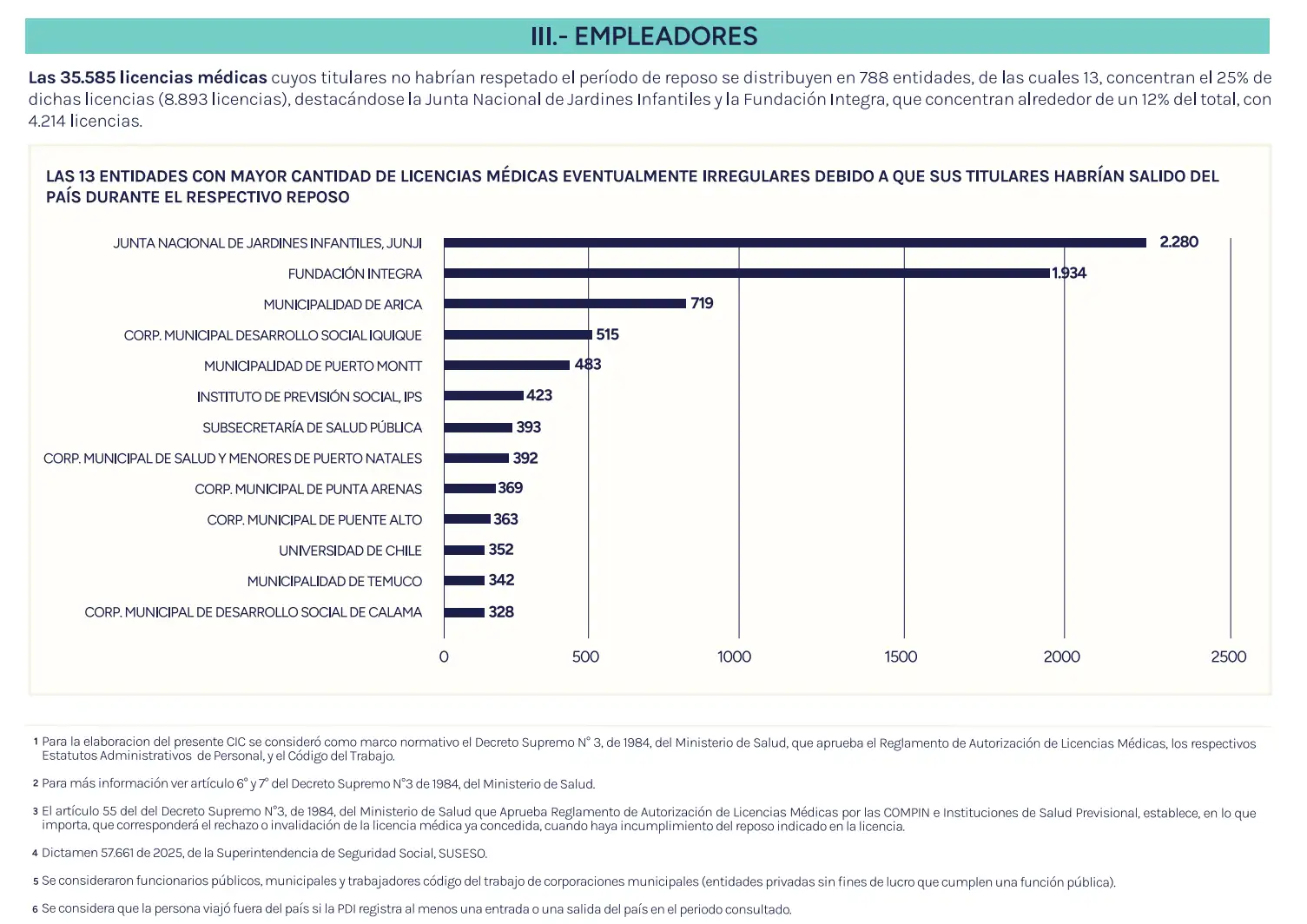 El informe de la CGR indica que según los datos entregados por la Policía de Investigaciones de Chile (PDI), los titulares de esas 35.585 licencias habrían entrado o salido del país en 59.575 oportunidades durante el respectivo permiso de reposo.