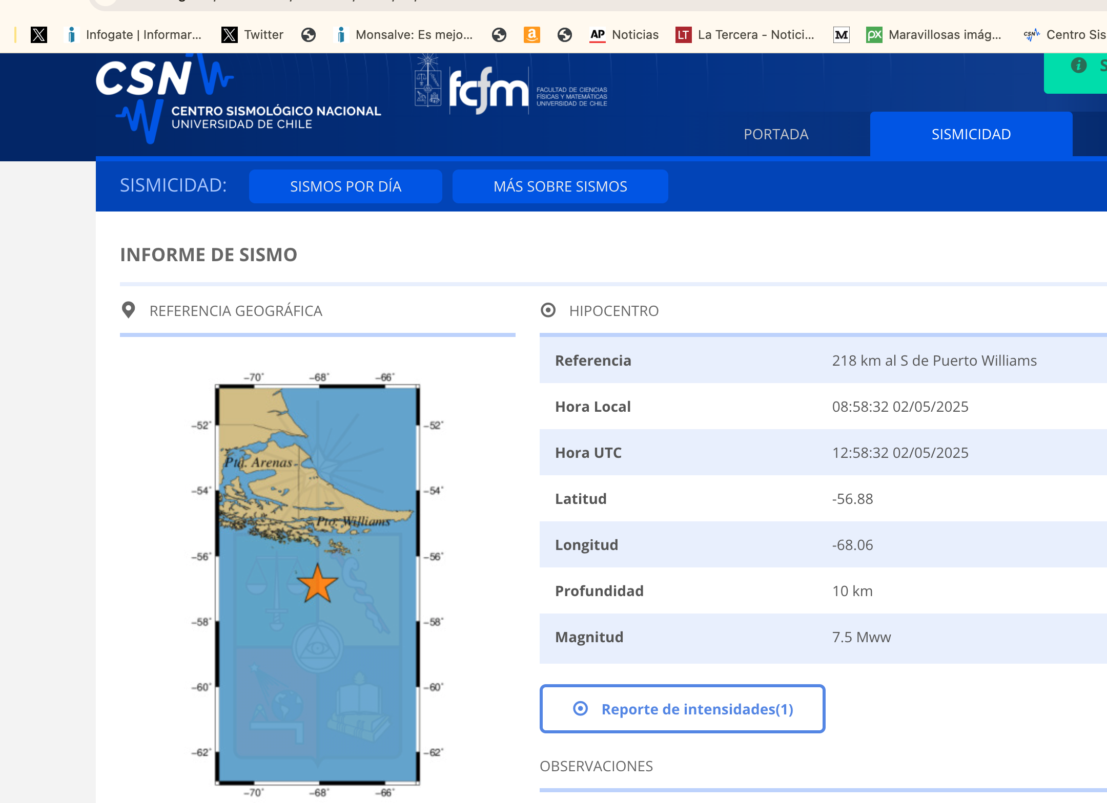 Un sismo de 7,5° ocurrió a 218 kilómetros al sur de Puerto Williams, en la zona austral del país, según informó el Centro Sismológico Nacional.