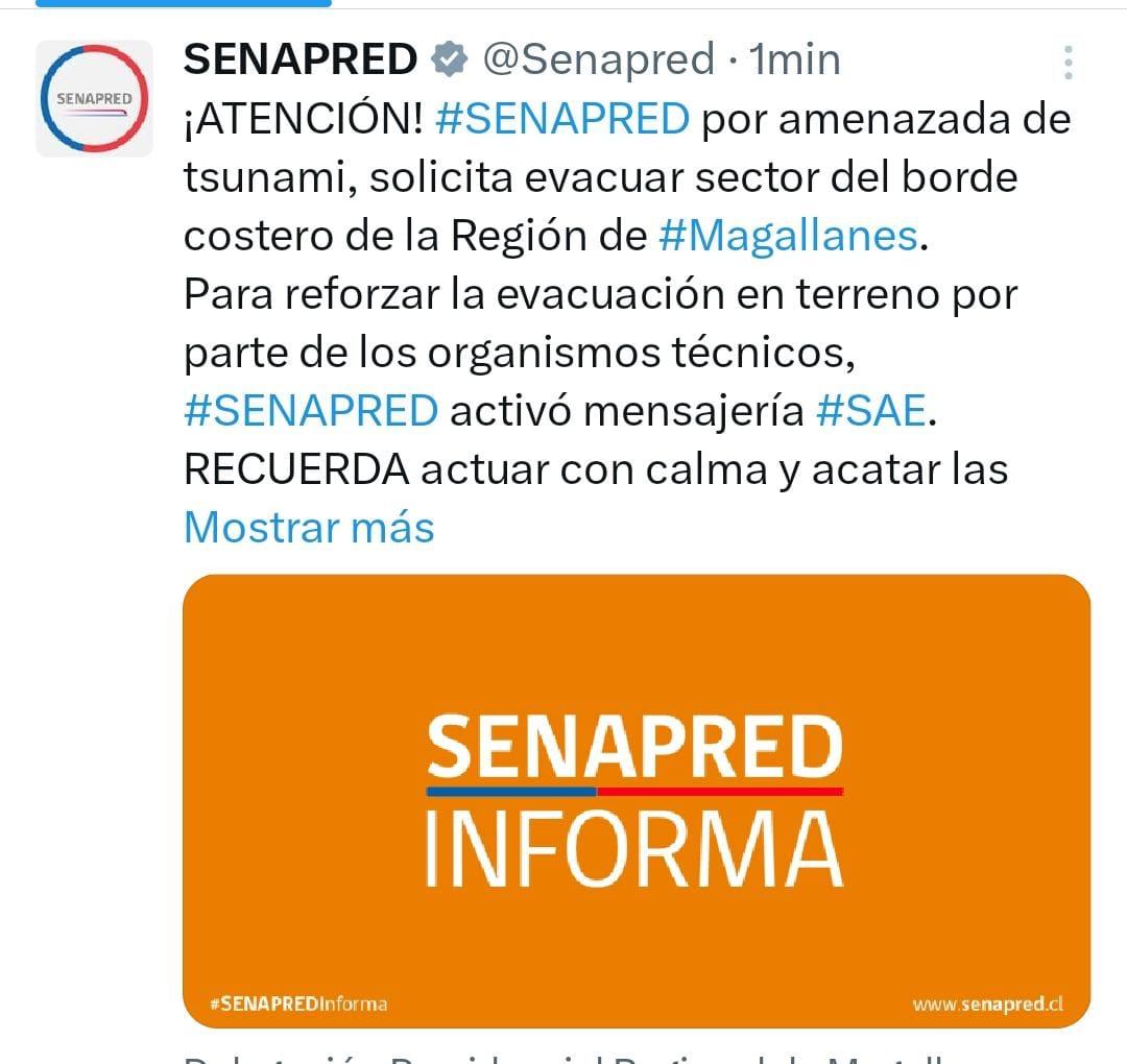 Frente a ello, el SHOA estableció «Alerta de Tsunami», ante lo cual Senapred estableció «evacuar hacia zona segura en los sectores costeros de la región de Magallanes. Asimismo, por estado de precaución, Senapred establece abandonar la zona de playa en el Territorio Antártico Chileno«.