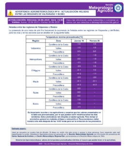 La Dirección Meteorológica (DMC) actualizó la advertencia agrometeorológica por heladas entre las regiones de Valparaíso hasta el Biobío.