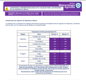 La Dirección Meteorológica (DMC) emitió una advertencia por heladas para las regiones de Valparaíso al Maule a partir de mañana viernes y hasta el sábado.