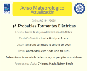 Por si fuera poco por el paso del sistema frontal que afecta la zona centro sur del país, la Dirección Meteorológica (DMC) emitió un aviso por probables tormentas eléctricas en cuatro regiones del país.