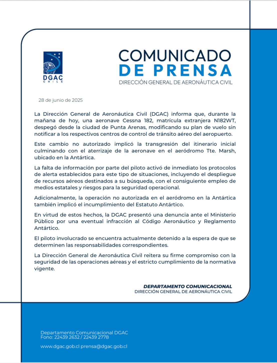 Esta tarde la Dirección de Aeronáutica Civil, DGAC de Chile emitió un comunicado dando cuenta de la detención de un piloto y su avión que voló desde Punta Arenas a la Antártica Chilena sin autorización.