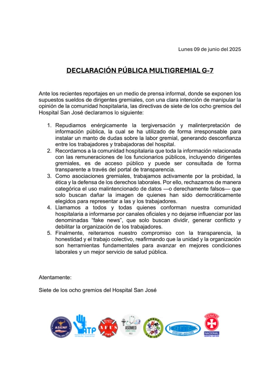 Por otra parte, como dirigentes gremiales (7 gremios), repudiamos la manipulación y tergiversación de información sobre supuestos, bajo acusaciones carentes de sustento que intentan desacreditar el trabajo gremial de un grupo de dirigentes.