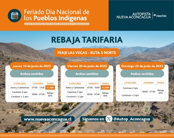 De acuerdo con las proyecciones de la Sociedad Concesionaria que opera Ruta 68 y el tramo Santiago – Los Vilos (Autopista Nueva Aconcagua), los peaks del flujo vehicular ocurrirían el jueves 19 de junio entre las 14:00 y las 24:00 horas, mientras que, para el regreso, el mayor tránsito se producirá el domingo 22 entre el mediodía y las 23:00 horas.