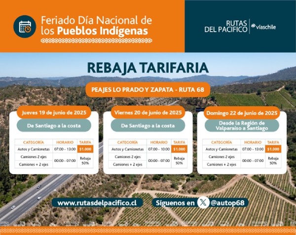 Desde Rutas del Pacífico (Ruta 68) informaron que se implementará una disminución tarifaria especial en las plazas de peaje Lo Prado y Zapata.
