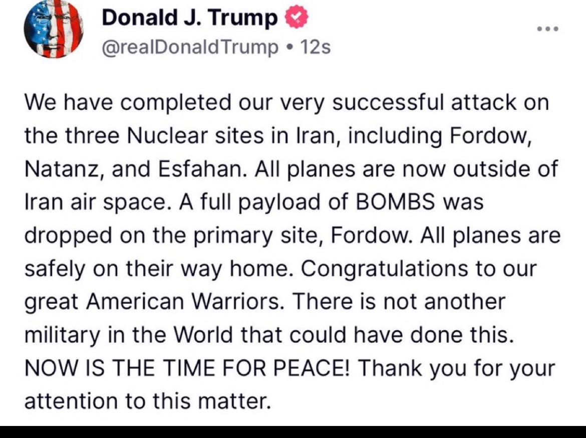 «Hemos completado con gran éxito nuestro ataque contra las tres instalaciones nucleares de Irán, incluyendo Fordow, Natanz e Isfahán. Todos los aviones se encuentran ahora fuera del espacio aéreo iraní. Se lanzó una carga completa de bombas sobre la instalación principal, Fordow. Todos los aviones regresan sanos y salvos a casa. Felicitaciones a nuestros grandes guerreros estadounidenses. Ningún otro ejército en el mundo podría haber hecho esto. ¡AHORA ES LA HORA DE LA PAZ! Gracias por su atención a este asunto», escribió el Jefe de Estado norteamericano en una publicación de su red social Truth Social.