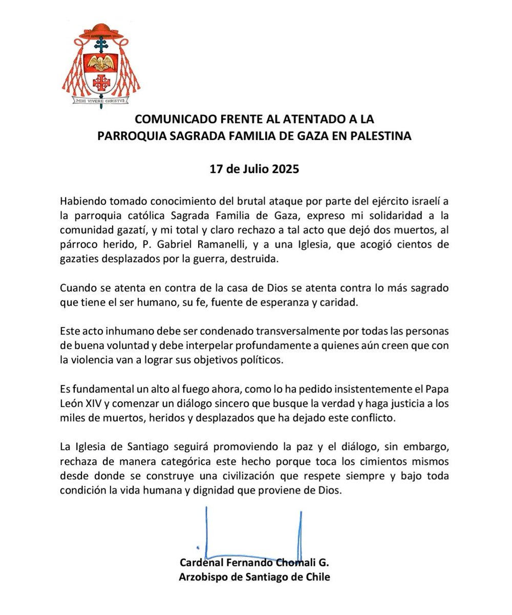 En su comunicado, el cardenal de Chile  emplaza al régimen de Netanyahu: “Cuando se atenta en contra de la casa de Dios se atenta contra lo más sagrado que tiene el ser humano, su fe, fuente de esperanza y caridad”.