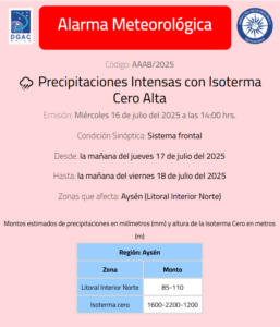 La Dirección Meteorológica (DMC) emitió esta jornada una alerta por fuertes precipitaciones que afectarán la región de Aysén.