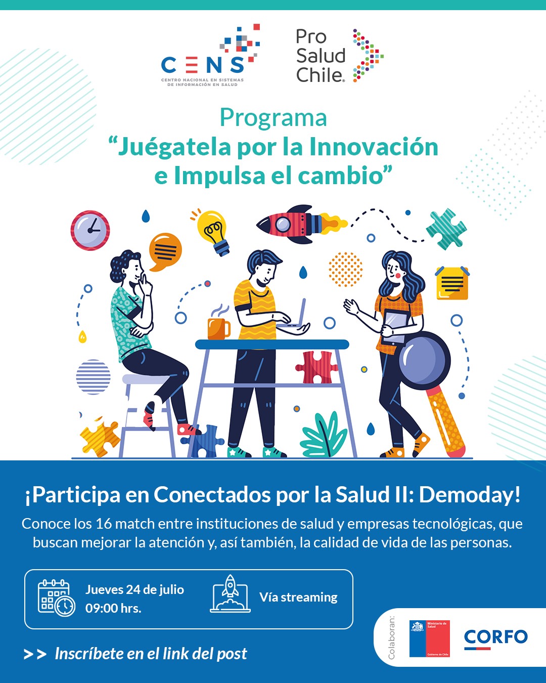 En este contexto, el próximo 24 de julio se realizará el evento “Conectados por la Salud II: Demoday”, durante el cual se presentarán las soluciones tecnológicas seleccionadas para pilotaje. Esta actividad se transmitirá en vivo de forma abierta por streaming. Para participar, las inscripciones son AQUÍ.