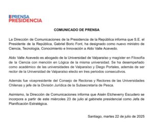A través de un comunicado, Presidencia señala que el Presidente Gabriel Boric “ha designado como nuevo ministro de Ciencia, Tecnología, Conocimiento e Innovación a Aldo Valle Acevedo”.