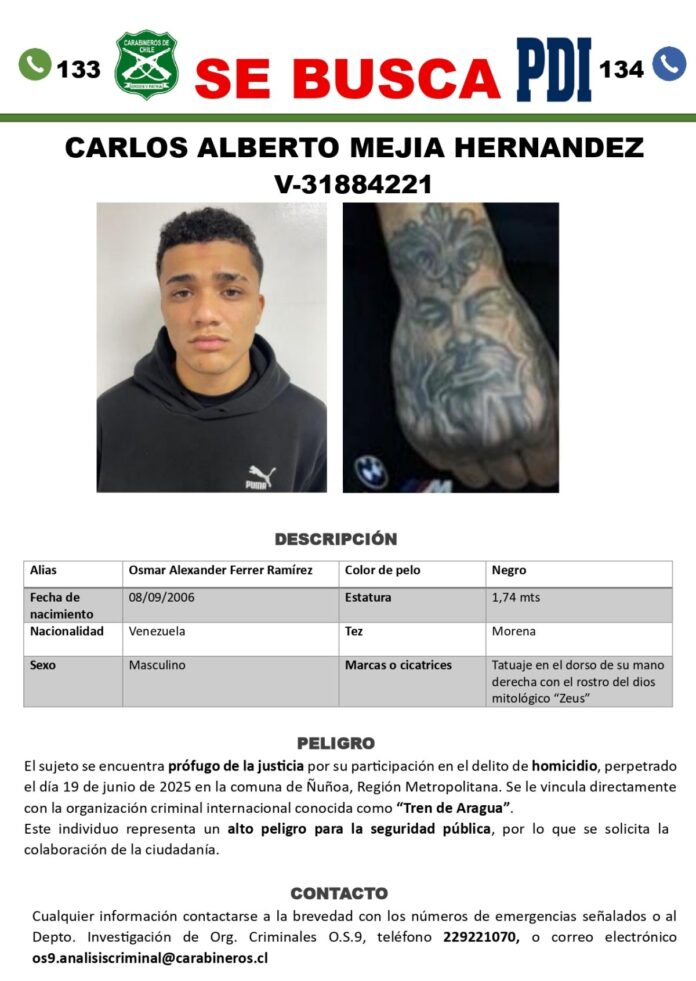 Carabineros y la PDI dieron a conocer una nueva identidad del sicario que fue liberado por la justicia, Osmar Ferrer, mostrando otro nombre que sería el verdadero: Carlos Alberto Mejía Hernández.