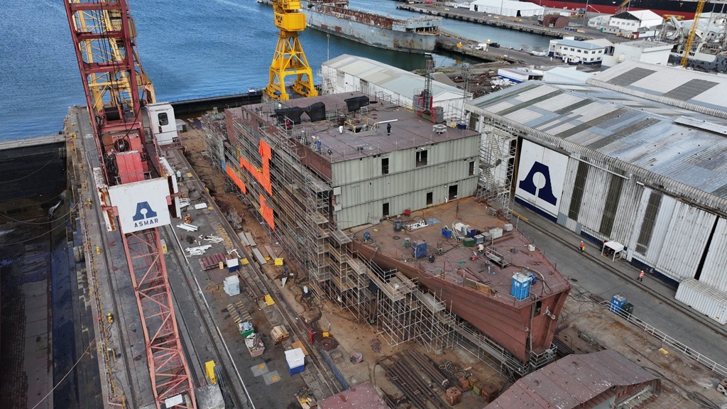 La primera unidad del proyecto Escotillón IV, que se construye en los Astilleros y Maestranzas de la Armada (ASMAR) en Talcahuano, ya alcanzó un 78% de avance en el armado de bloques en grada y cerca del 50% de avance total.