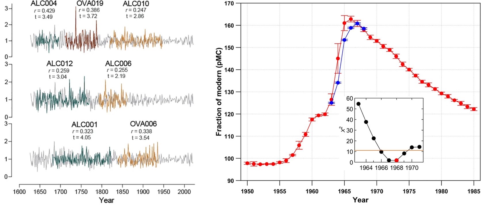 De cada sitio de muestreo se obtuvo un mínimo de 15 durmientes en buen estado de conservación y se analizaron sus anillos en laboratorio. Para determinar si estos servían como archivos climáticos y ambientales de largo plazo, se realizó un cruce de información cronológica con patrones de crecimiento de anillos de robles vivos del sur de Chile (Figura 2A). Con ello se lograron datar o fechar las muestras de anillos de crecimiento provenientes de los durmientes. Para corroborar estas dataciones, se comparó también el nivel de radiocarbono de los durmientes con la curva del hemisferio sur de radiocarbono para el período conocido como el “pico de la bomba”, el cual es el período de detonaciones nucleares masivas ocurridas durante la Guerra Fría y que ha quedado registrado globalmente en los anillos de árboles de ese período (Figura 2B).