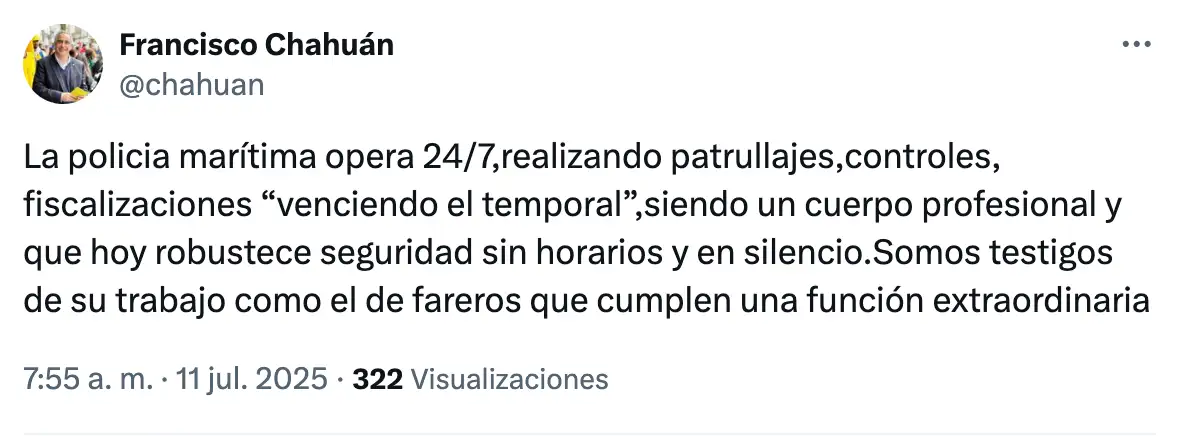 “La Policía Marítima opera 24/7, realizando patrullajes, controles, fiscalizaciones “venciendo el temporal”, siendo un cuerpo profesional que hoy robustece seguridad sin horarios y en silencio. Somos testigos de su trabajo como el de fareros que cumplen una función extraordinaria”, emplazó Chauhán en su cuenta de X.
