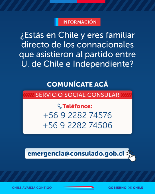 La Cancillería dispuso contactos de emergencia consular para orientar y asistir a familiares de los hinchas de Universidad de Chile tras los incidentes ocurridos en el estadio de Independiente.