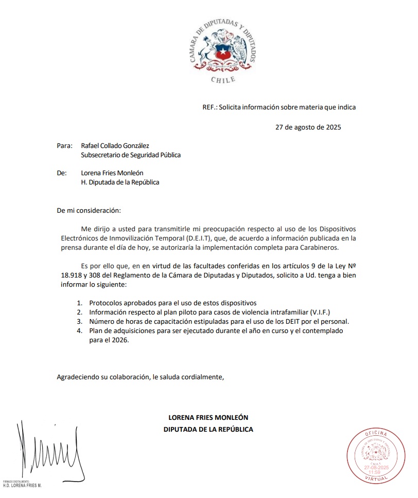 «Al respecto, y sabiendo que tiene ciertas restricciones su uso, estamos oficiando al Ministerio de Seguridad para efectos de saber, uno, los planes de capacitación en el uso de taser, dos, el número de taser que se compraron, y tercero, lo más importante, para qué uso se están comprando las taser, ya que se aconsejan sólo para asuntos restringidos, nunca para temas de orden público», explicó.