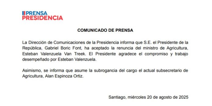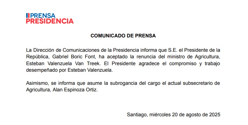 Por medio de un comunicado, se señaló que «el Presidente de la República, Gabriel Boric Font, ha aceptado la renuncia del ministro de Agricultura, Esteban Valenzuela Van Treek. El Presidente agradece el compromiso y trabajo desempeñado por Esteban Valenzuela».