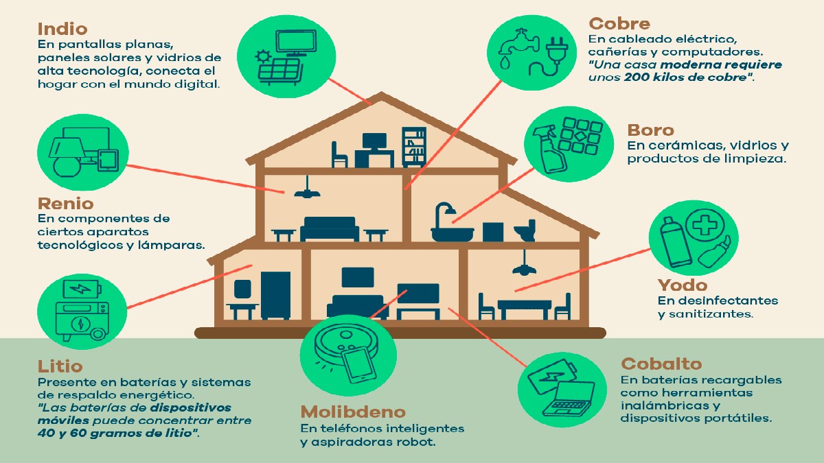 - Desde los enchufes hasta los vidrios de las ventanas, una vivienda chilena cuenta con más metales de lo que podríamos imaginar. En su interior conviven el cobre, litio, molibdeno, hierro, yodo, entre otros; insumos esenciales que permiten encender la luz, abrir la llave del agua o conectarte a internet.