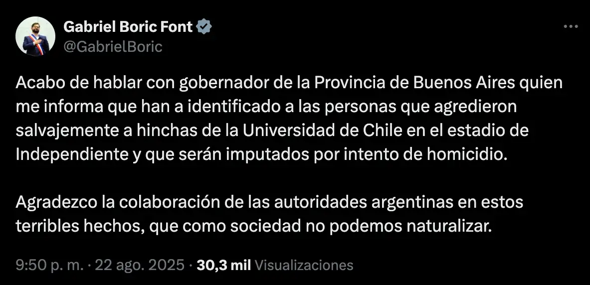 «Acabo de hablar con gobernador de la Provincia de Buenos Aires quien me informa que han a identificado a las personas que agredieron salvajemente a hinchas de la Universidad de Chile en el estadio de Independiente y que serán imputados por intento de homicidio. Agradezco la colaboración de las autoridades argentinas en estos terribles hechos, que como sociedad no podemos naturalizar», posteo esta noche el Presidente Gabriel Boric.