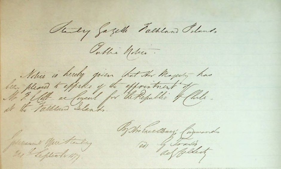 Hoy se cumplen oficialmente 148 años desde que quedó documentado en el “Stanley Gazette” la aprobación de su Majestad la Reina Victoria de Frederick E. Cobb como primer Cónsul de la República de Chile en Stanley en las islas Falkland.