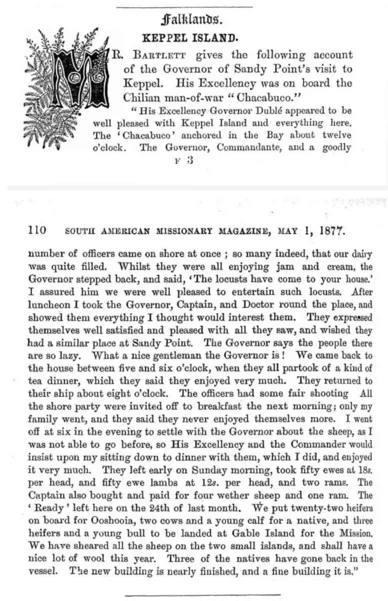 La visita a la Isla Keppel está documentada en la revista SAMM (South American Missionary Magazine de Mayo de 1877) y muestra como los tripulantes de la corbeta aprovecharon la instancia para comer una cantidad abismal de mermeladas y dulces.
