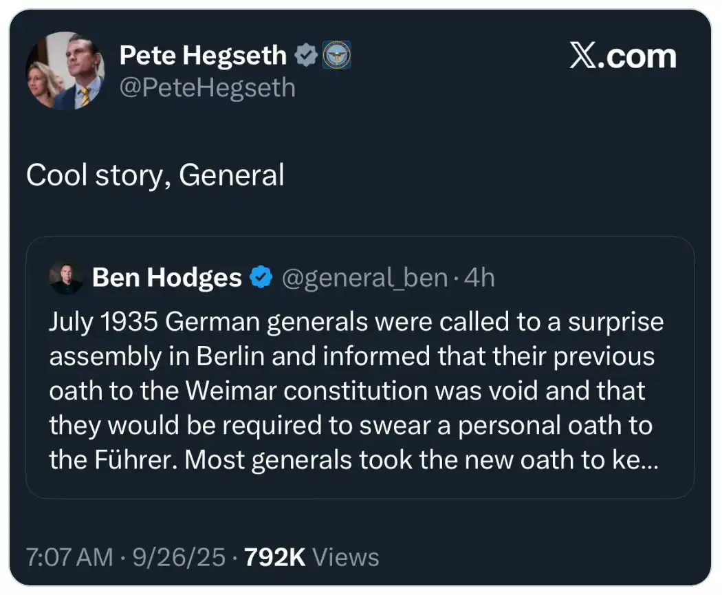 Ben Hodges, excomandante general del Ejército de EE. UU. en Europa, escribió en X el viernes que, en julio de 1935, los generales alemanes fueron convocados a una asamblea sorpresa en Berlín y se les informó que su juramento anterior a la Constitución de Weimar era nulo y que se les exigiría prestar juramento personal al Führer.