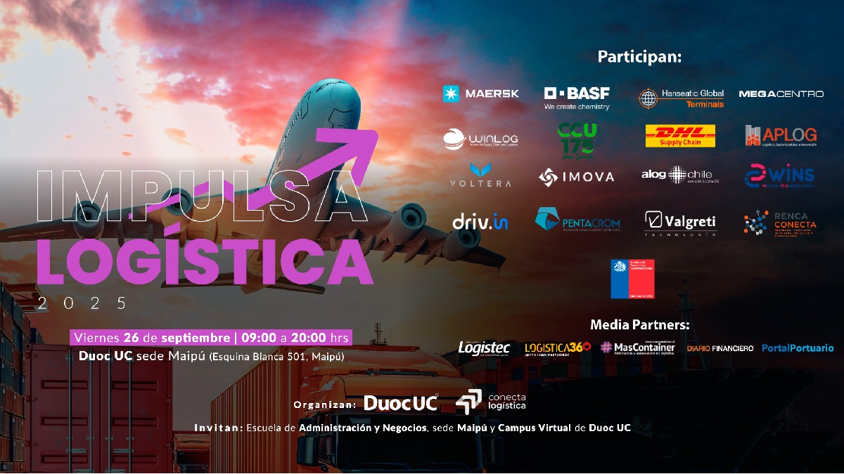 La Escuela de Administración y Negocios de Duoc UC, en alianza con Conecta Logística, presentará este viernes 26 de septiembre Impulsa Logística, un encuentro abierto a la comunidad que busca acercar el mundo de la logística y sus principales desafíos. La cita tendrá lugar en la sede Maipú de Duoc UC, de 9:00 a 20:00 horas, y ofrecerá charlas magistrales, conversatorios, trade shows interactivos y espacios de networking. La inscripción es gratuita en este link.