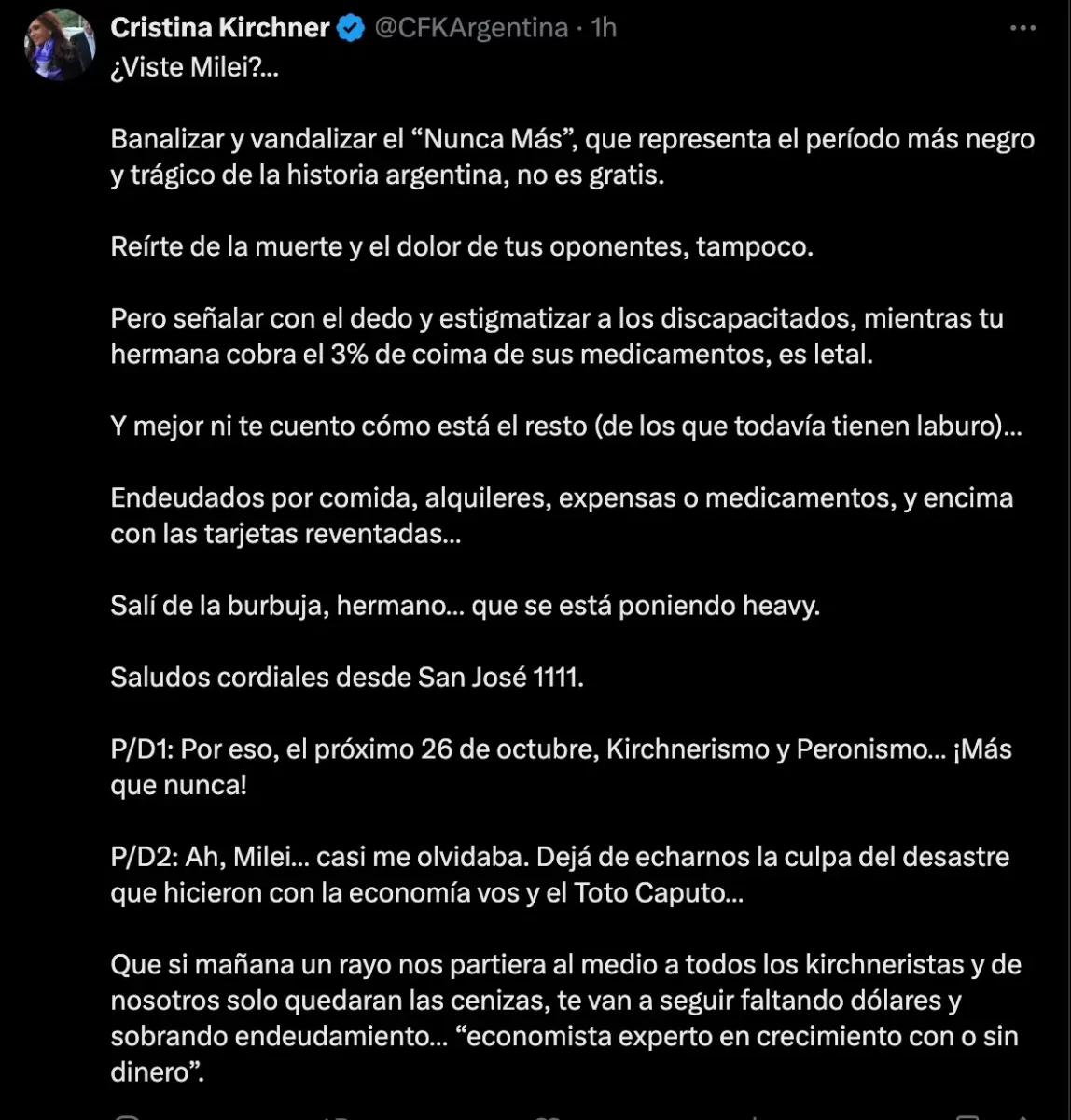 En su cuenta de X la ex presidenta peronista, cristina Fernandez, con estilete entintado escribió: