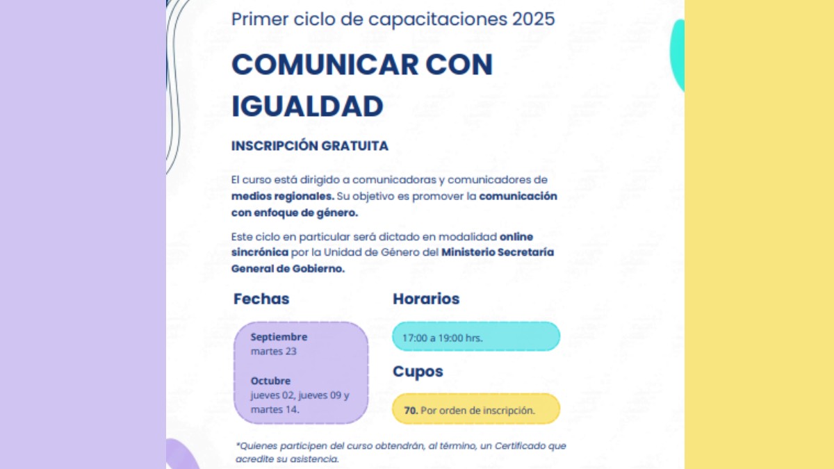 El Ministerio Secretaría General de Gobierno, junto al Ministerio de la Mujer y Equidad de Género, invita a comunicadoras y comunicadores de medios regionales a participar en el primer ciclo de capacitaciones 2025: “Comunicar con Igualdad”, una instancia gratuita que busca promover la comunicación con enfoque de género.