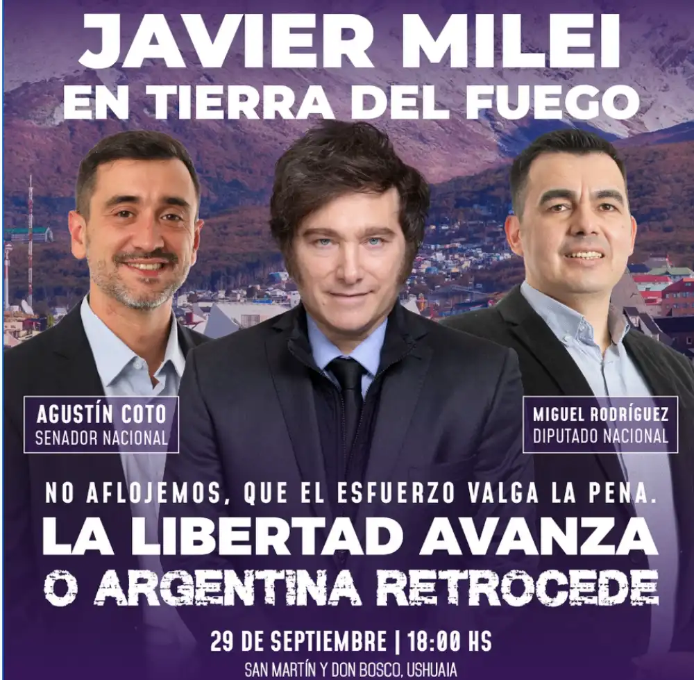 Milei va a tratar de apuntalar a sus alicaídos candidatos al Parlamento: Agustín Coto, candidato a senador y a Miguel Rodríguez, aspirante a diputado, en las elecciones del 26 de octubre próximo.