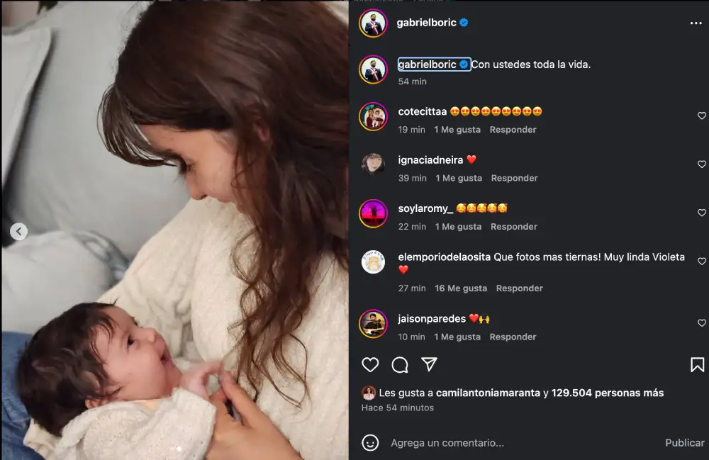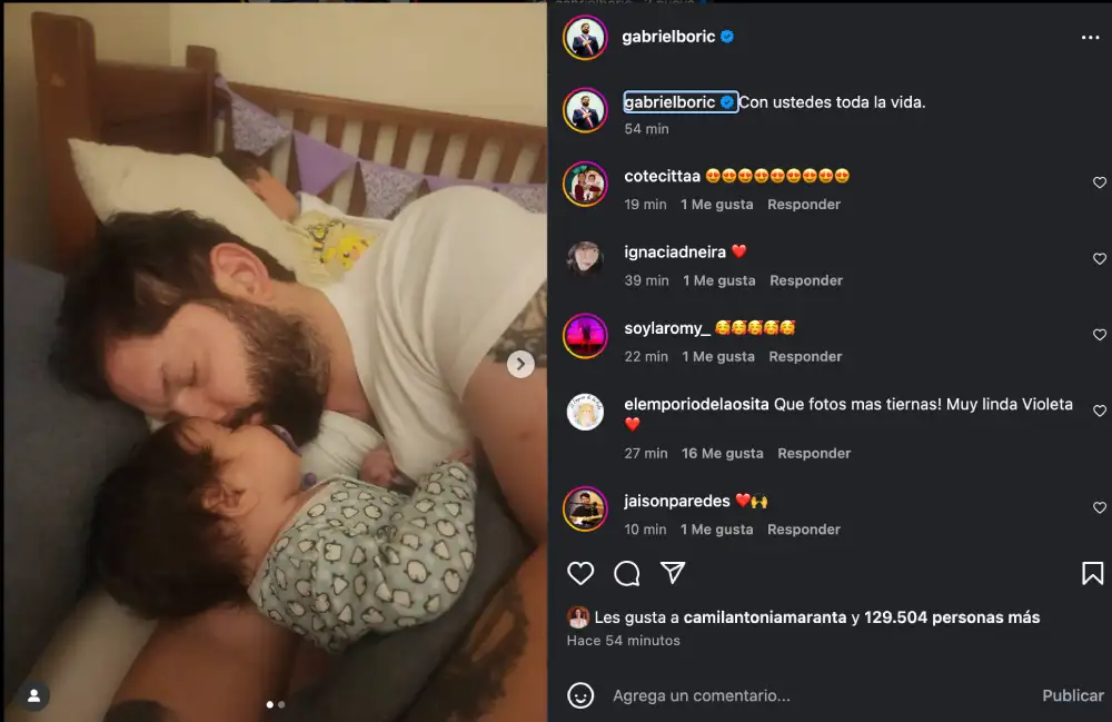El Presidente Gabriel Boric, ha subido una tierna foto a su cuenta de Instagram bajo el comentario «Con ustedes toda la vida» y junto a su hija Violeta.