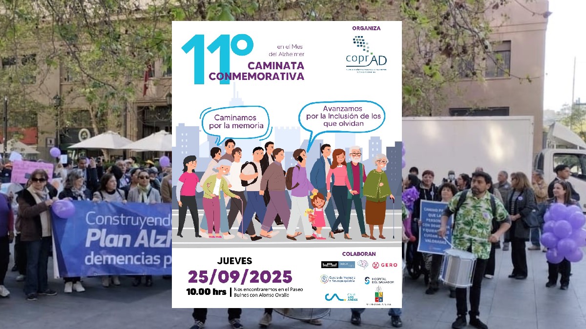 En el marco del Mes Internacional del Alzheimer, la Corporación Profesional de Alzheimer y Otras Demencias (COPRAD), con el apoyo de la Caja de Compensación Los Andes y la colaboración del Servicio Nacional del Adulto Mayor (SENAMA), invita a toda la comunidad a participar en la decimoprimera Caminata Nacional por el Alzheimer, que se realizará el jueves 25 de septiembre a las 10:00 horas, con punto de encuentro en Paseo Bulnes esquina Alonso Ovalle, en pleno centro de Santiago.