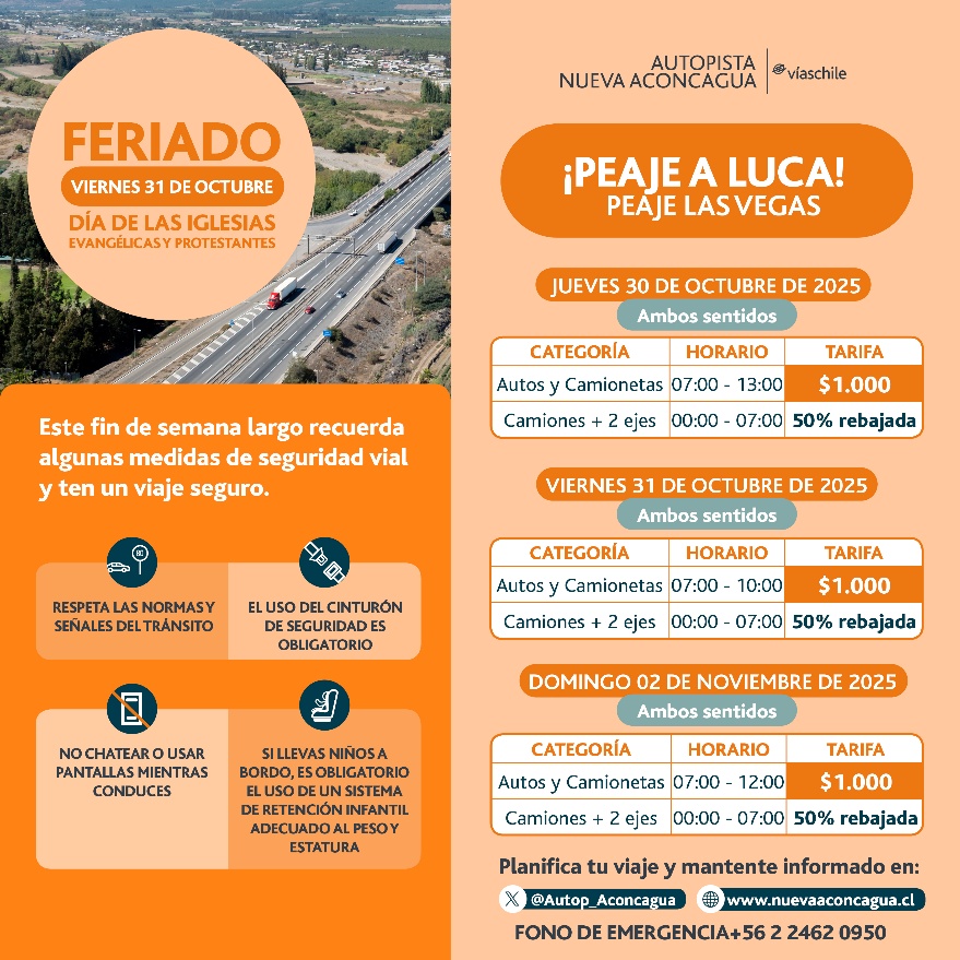 VíasChile, con su sociedad concesionaria Autopista Nueva Aconcagua (Ruta 5, Tramo Santiago-Los Vilos), anunció la implementación de un plan de contingencia por el feriado largo que se producirá en el contexto del Día Nacional de las Iglesias Evangélicas y Protestantes. Esto, considera la rebaja tarifaria decretada por el Ministerio de Obras Públicas en determinados horarios del jueves 30 y viernes 31 de octubre, así como el domingo 02 de noviembre. Además, se dispondrá el total de los recursos de apoyo con los que cuenta la autopista y se utilizarán medidas de precaución para promover un viaje más seguro entre quienes se trasladen por la ruta.
