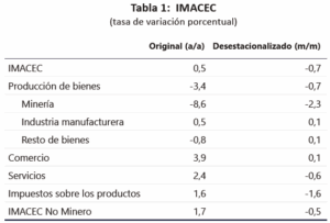 El Imacec no minero presentó un crecimiento anual de 1,7%, mientras que en términos desestacionalizados cayó 0,5% respecto del mes anterior y creció 2,7% en doce meses.